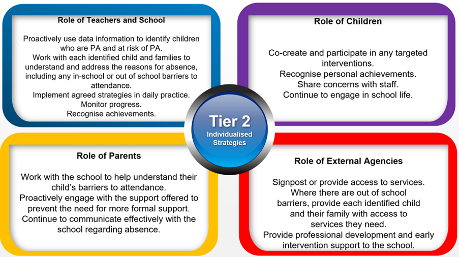 Tier 2 – Individualised Strategies and Early Help Support: Tailoring strategies to individual needs and providing early help support for persistent attendance challenges.