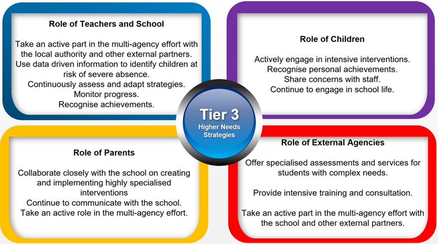 Tier 3 – Higher Needs Strategies Support: Furnishing specialised support for children, young people, and families with complex attendance requirements, including access to external agency support when necessary.