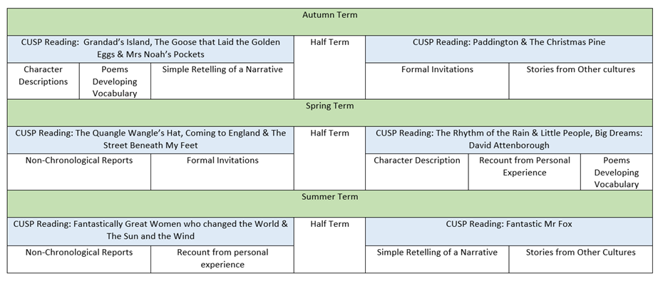 We follow the CUSP Writing Curriculum (below) which is carefully sequenced to ensure children become confident and competent writers. In Year 2, children learn to write simple, coherent narratives about personal experiences and those of others (real or fictional) and write about real events, recording these simply and clearly.